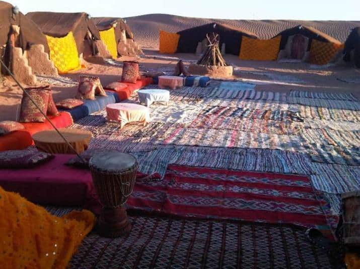 Après le petit déjeuner départ en 4×4 pour la visite du Ksar Mhamid village dans la palmeraie en suite prendre la piste sablonneuse pour les grandes dunes de Chegaga. arrêt à l’oasis sacrée pour un thé et ensuite arrivée au bivouac de Chegaga pour le repas de midi . L’après-midi balade à dos de dromadaire pour 1h dans les dunes, pour assister au coucher de soleil, dîner au bivouac et soirée animée sous les étoiles .