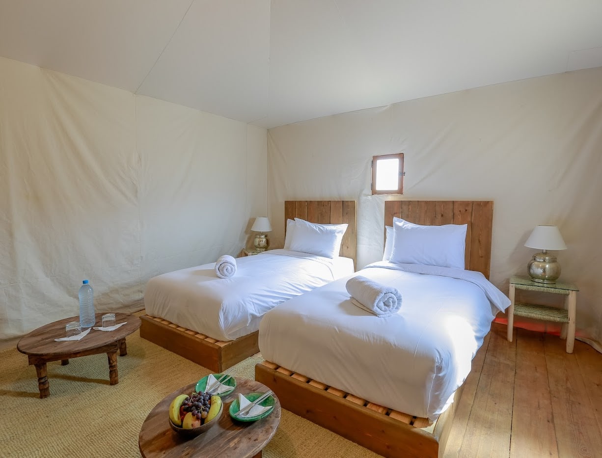 • Le séjour en pension complète sur la base d’une tente  au  bivouac de luxe.