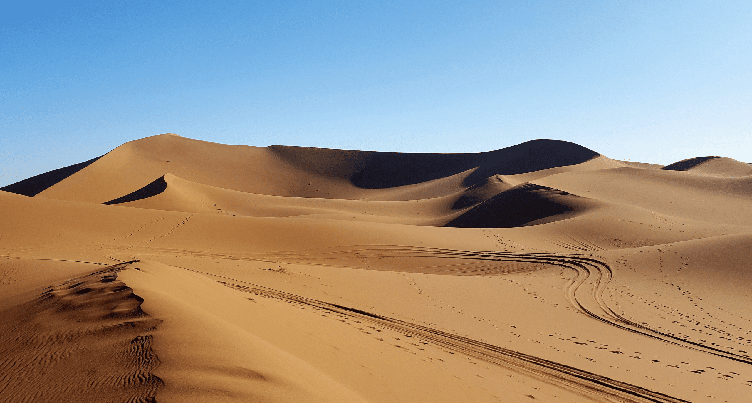 Départ de M’hamid en 4×4 vers 14h pour les dunes de Chegaga, 2 heures de piste avec halte à l’oasis sacrée. Arrivée aux grandes dunes pour assister au coucher de soleil, du haut de la plus haute (30 mn à pied pour y accéder).